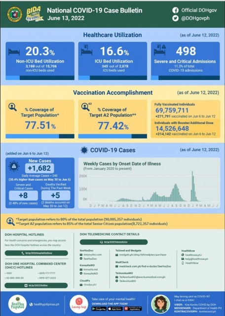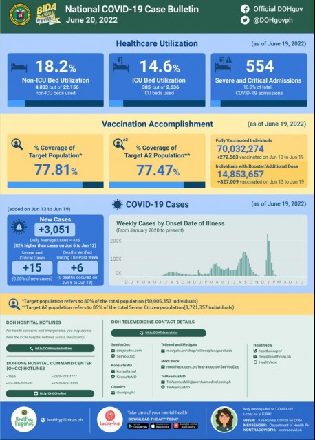 As of Sunday, June 19, there were also 554 severe and critical admissions. The number of severe and critical admissions as of June 12 were 498. The percentage of severe and critical admissions this past week was, however, slightly lower at 10.2 percent compared to total Covid-19 admissions. This was because there were more new cases the past week at 3,051.
