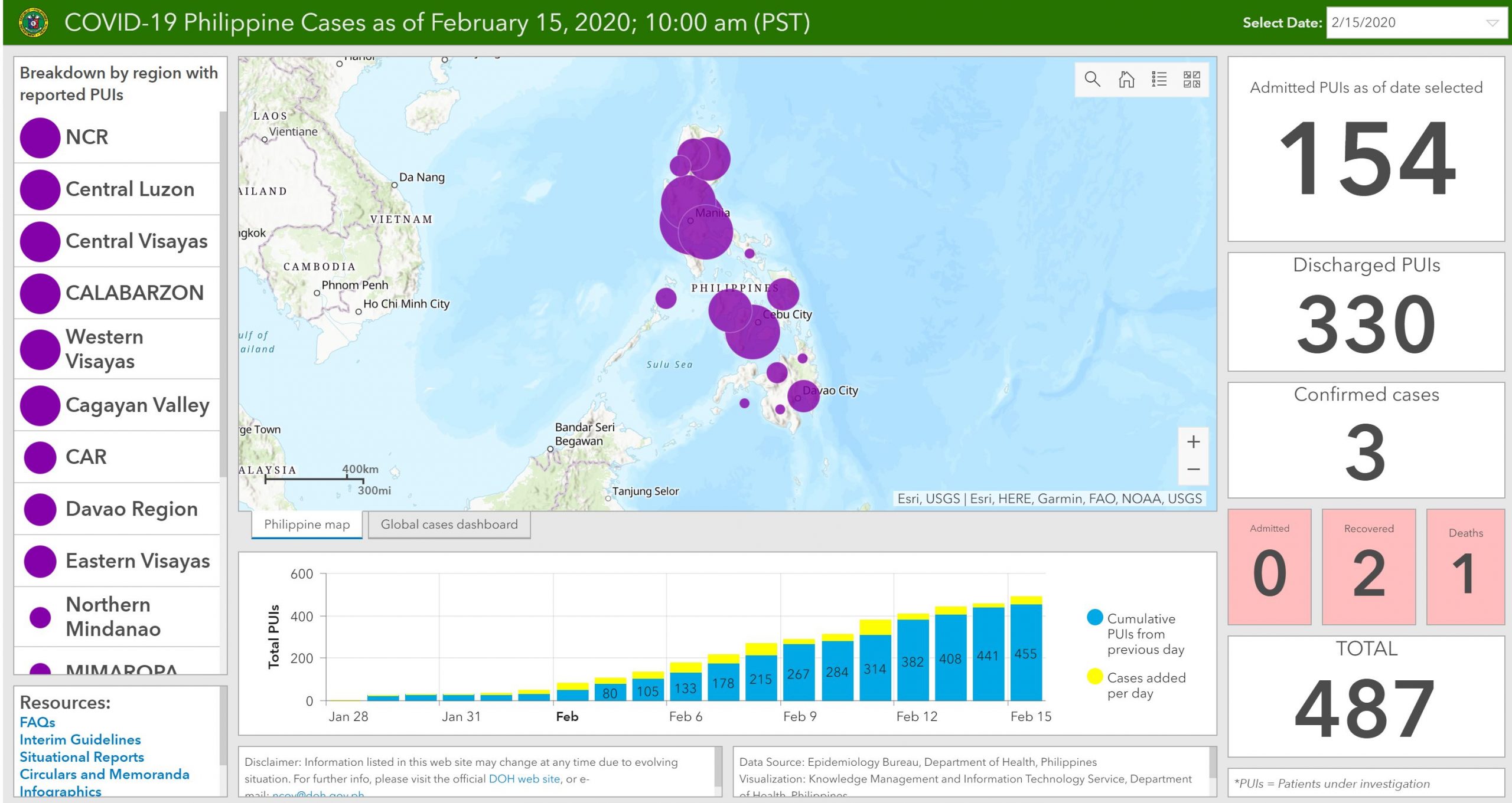 (Eagle News) – The Department of Health has recorded a total of 487 persons under investigation (PUIs) for the novel coronavirus disease 2019 or COVID-19 as of Saturday, Feb. 15, 2020.