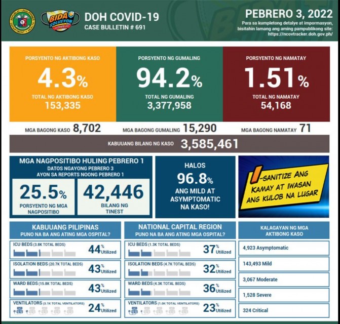 (Eagle News) – The Department of Health reported a slightly higher number of new Covid-19 cases on Thursday, February 3, at 8,702, from Wednesday’s 7,661.
