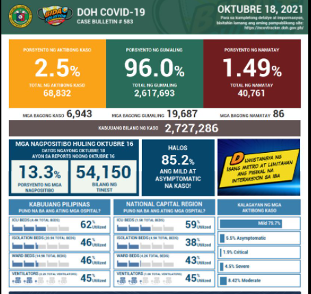 The DOH said 6.943 new virus cases were recorded, while new recoveries were 19,687. This brought the total active cases to just 68,832 or 2.5 percent of total COVID-19 cases.