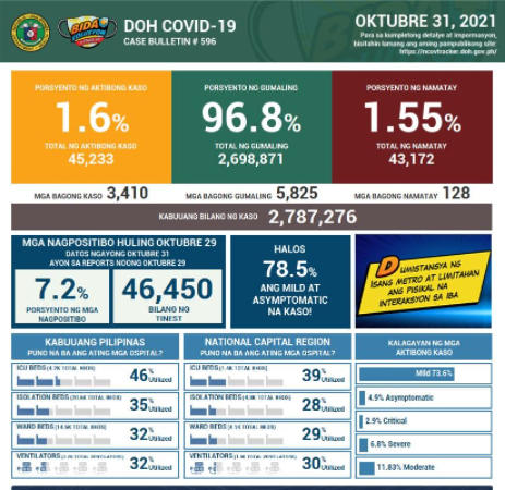 (Eagle News) — The Department of Health recorded 3,410 new COVID-19 cases bringing the total active cases to just 45,233 as of Sunday, Oct. 31.