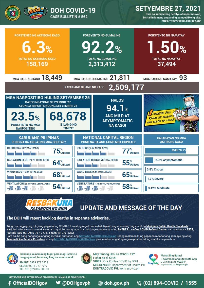 (Eagle News)–The Department of Health reported 18,449 more COVID-19 cases on Monday, Sept. 27, pushing the total COVID-19 cases in the Philippines to 2,509,177.