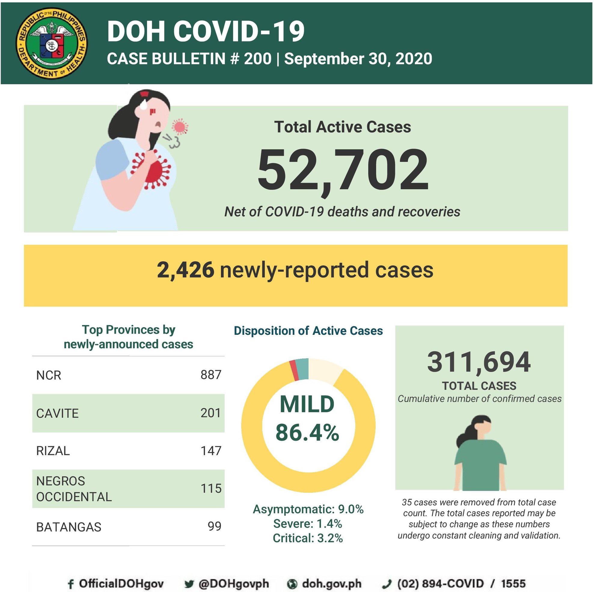 (Eagle News) — COVID-19 cases in the country breached the 311,000 mark on Wednesday, Sept. 30, after the Department of Health reported 2426 additional cases.