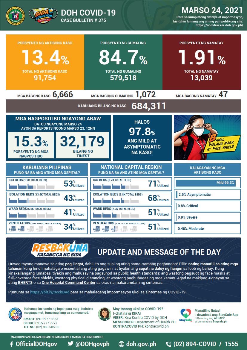 (Eagle News) — Philippine COVID-19 cases reached 684,311 on Wednesday, March 24, after the Department of Health reported 6666 additional cases.