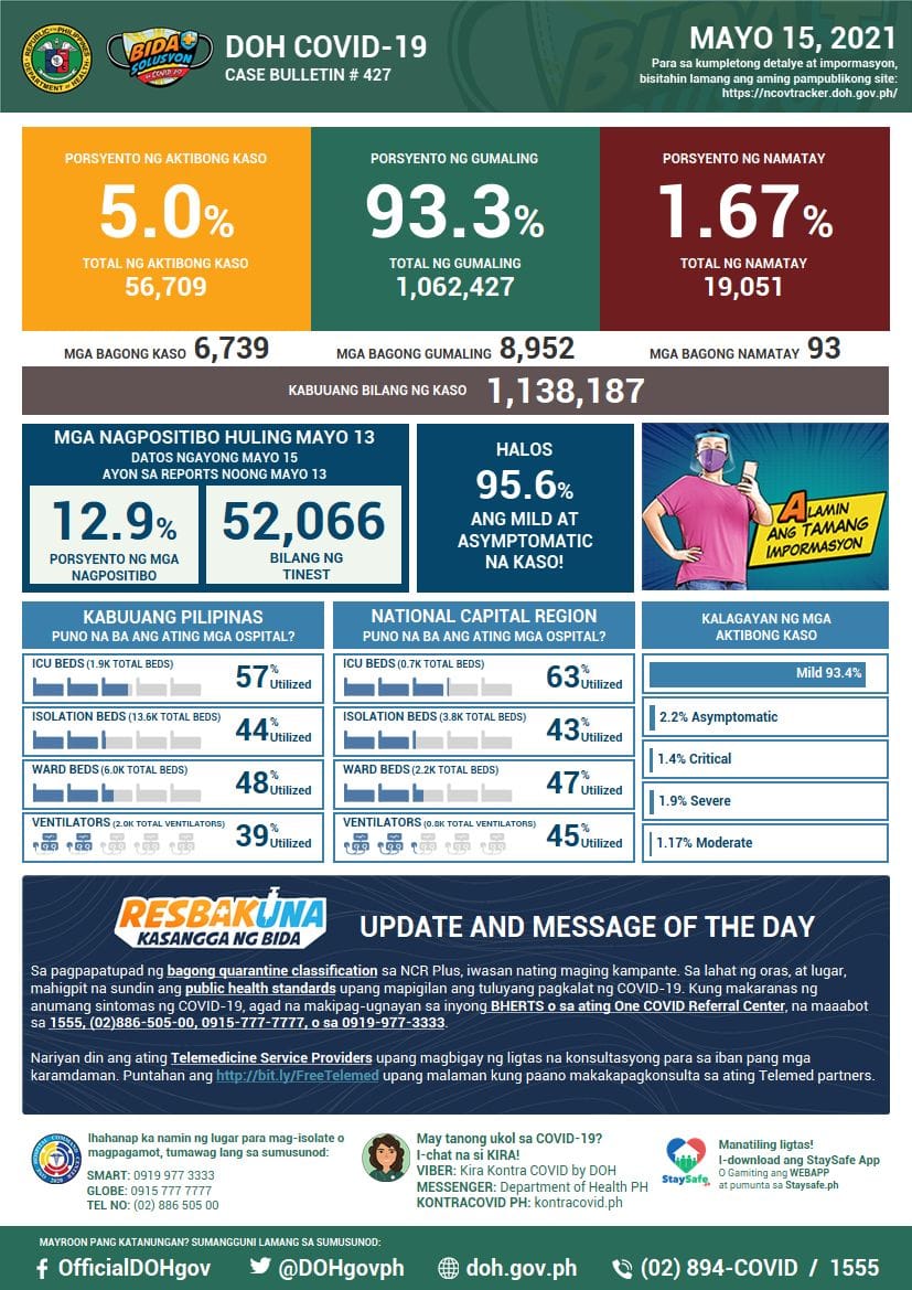 (Eagle News) — COVID-19 cases in the Philippines reached 1,138,187 on Saturday, May 15, after the Department of Health reported 6739 additional cases.