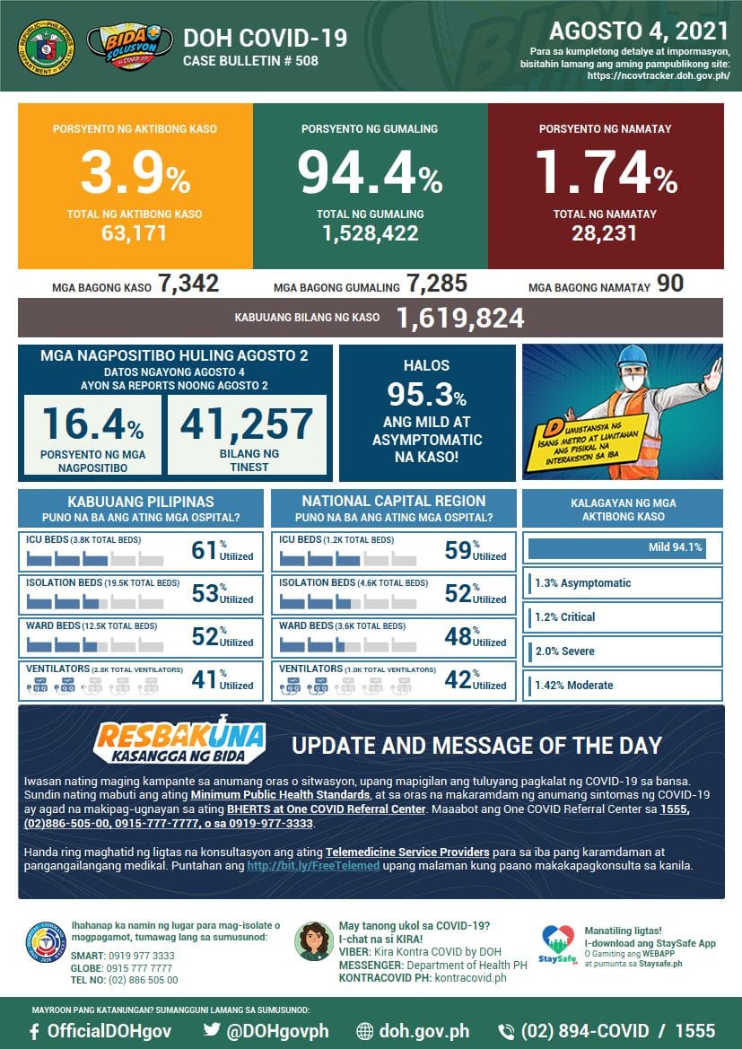 (Eagle News) — Detected COVID-19 cases in the Philippines climbed to 1,619,824 after the Department of Health reported 7342 additional cases.