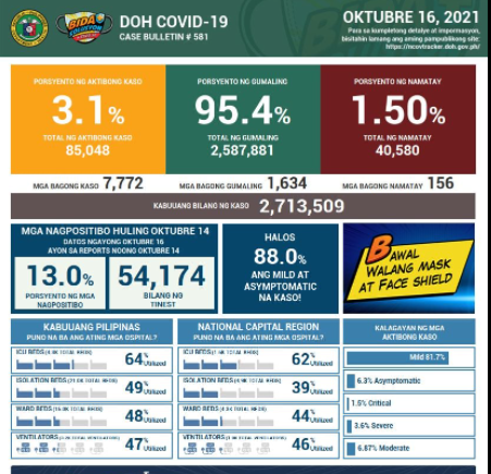 New deaths, on the other hand, were 156. On Friday, Oct. 15, new virus fatalities were 203. Total COVID deaths as of Saturday, Oct. 16, reached 40.580.