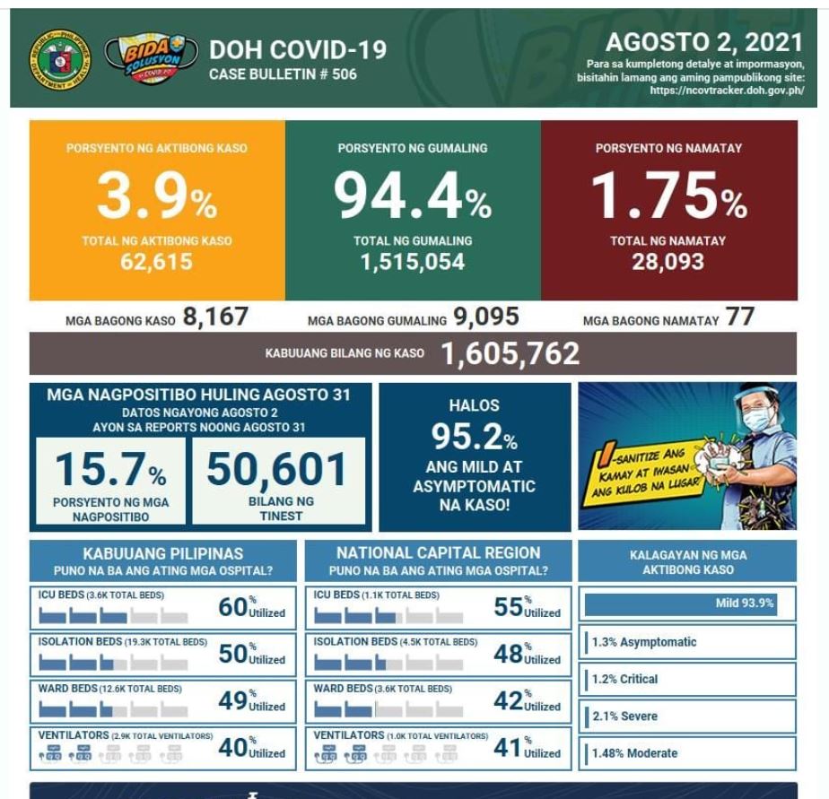 (Eagle News) – The Department of Health (DOH) said there were 8,167 new cases of COVID-19 added on Monday, Aug. 2, bringing the total number of confirmed cases so far at 1,605,762.