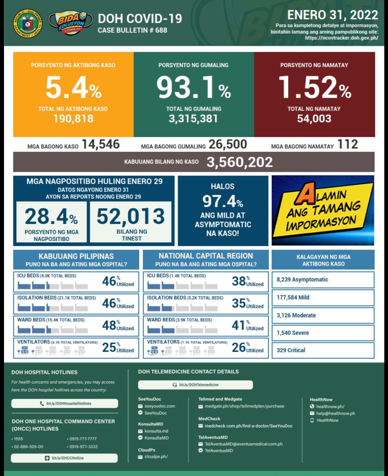 (Eagle News) – The Department of Health reported even lower new Covid-19 cases at 14,546 and more new recoveries at 26,500 on Monday, January 31.
