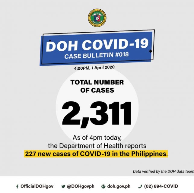 (Eagle News) – Total confirmed coronavirus cases in the country again rose dramatically, climbing to 2,311 after the addition of 227 new cases, the Department of Health said.