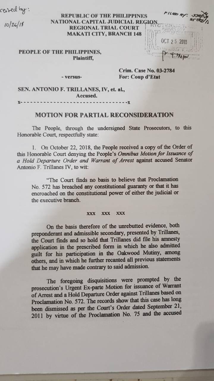 (Eagle News) – The Department of Justice has filed its motion for partial reconsideration with the Makati Regional Trial Court branch 148, seeking a partial reversal of its ruling on the non-issuance of an arrest warrant for Senator Antonio Trillanes IV.
