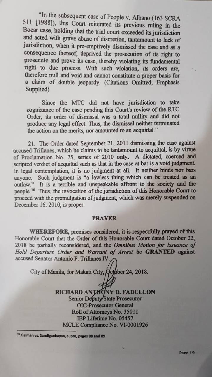 “The Honorable Court also erred in ruling that its Oder od Dismissal of the case against accused Trillanes dated September 21, 2011, has become final and executory and therefore immutable,” said Fadullon in the DOJ’s motion.