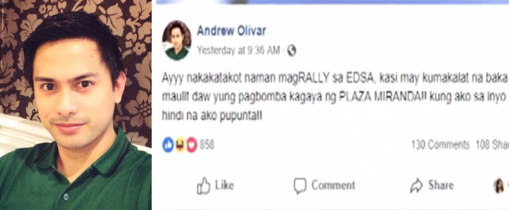 Sa post ni Olivar, sinabi nito sa kanyang followers na nakakatakot na mag-rally sa EDSA dahil may kumakalat na ulat na baka maulit ang Plaza Miranda bombing.