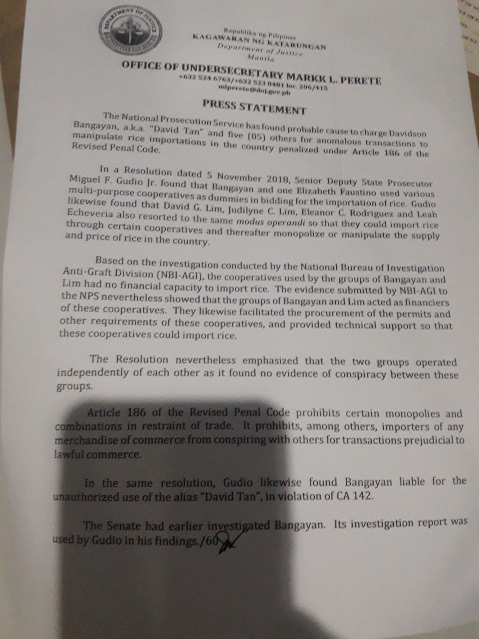 In a resolution dated Nov. 5, the DOJ said Bangayan, whom it also found guilty for the unauthorized use of the alias “David Tan,” and Elizabeth Faustino used “multipurpose cooperatives as dummies in bidding for the importation of rice.”