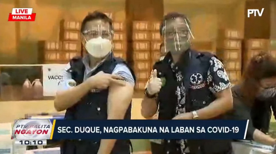 Duque was given the SInovac jab at around 10 a.m. at the Department of Health office compound where some 70 more DOH officials are also set to be vaccinated. He is vaccinated as part of the A2 sector (elderly group) in the vaccine priority list.