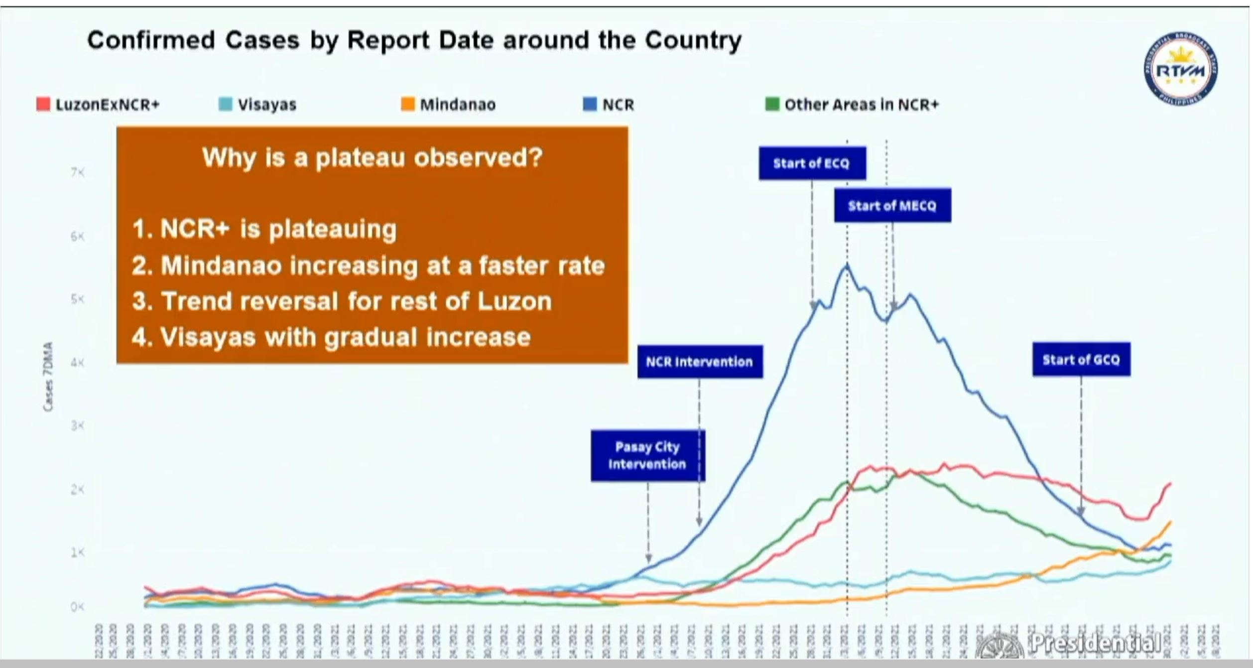 “Ang Mindanao ay tumataas nang mabilis at ang — mayroon pong trend reversal for the rest of Luzon at ang Visayas ay may dahan-dahan na pagtaas ng mga kaso,” Duque said.