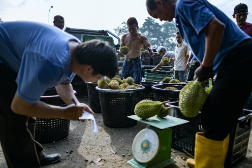 Malaysians are dashing to durian stalls across the country to munch on the pungent, spiky fruit after a long spell of unusually warm weather led to a bumper crop and sent prices tumbling. / AFP PHOTO / Mohd RASFAN