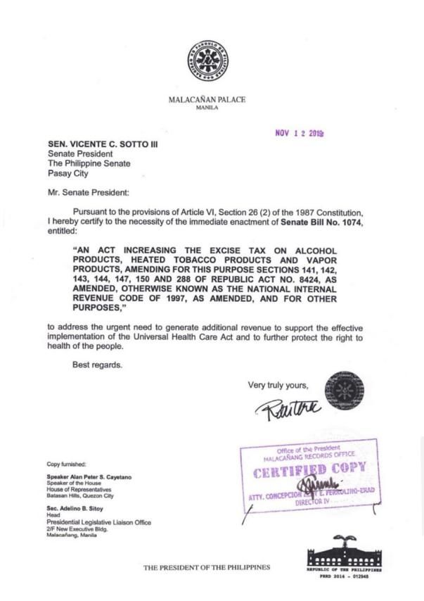 In a Nov. 12 letter to Senate President Tito Sotto, Duterte said he was certifying Senate Bill No. 1074 as urgent to “address the urgent need to generate additional revenue to support the effective implementation of the Universal Health Care Act..”