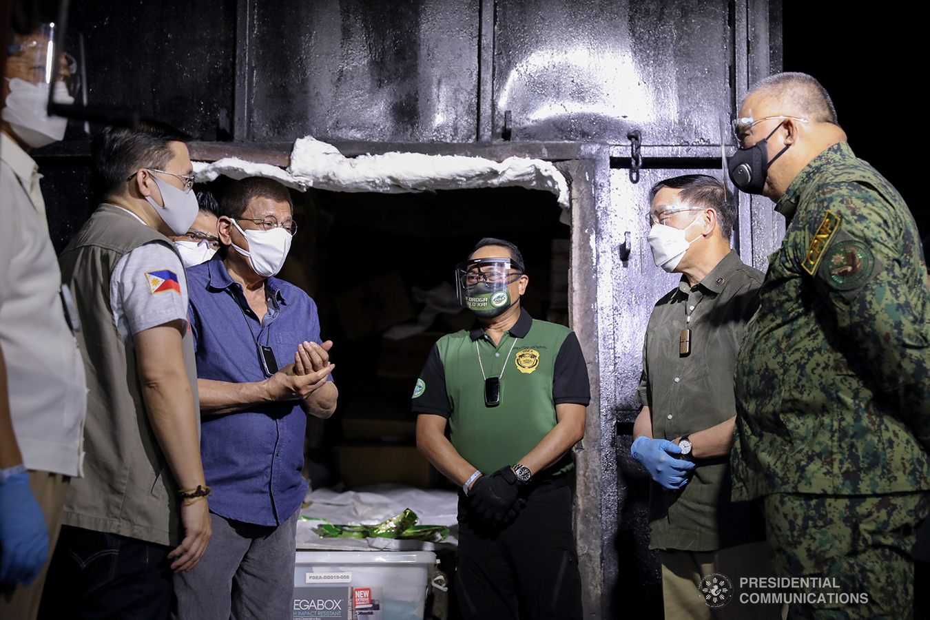 Justice Secretary Menardo Guevarra, PDEA Director General Wilkins Villanueva, PNP Chief Police General Debold Sinas and Sen. Christopher Lawrence “Bong” Go were with the President during the destruction of the P7.51-billion worth of confiscated illegal drugs.