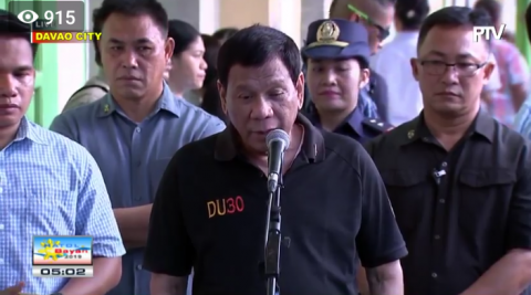 President Rodrigo Duterte speaks to reporters after he cast his vote in his polling precinct in Davao on Monday, May 13./PTV4/