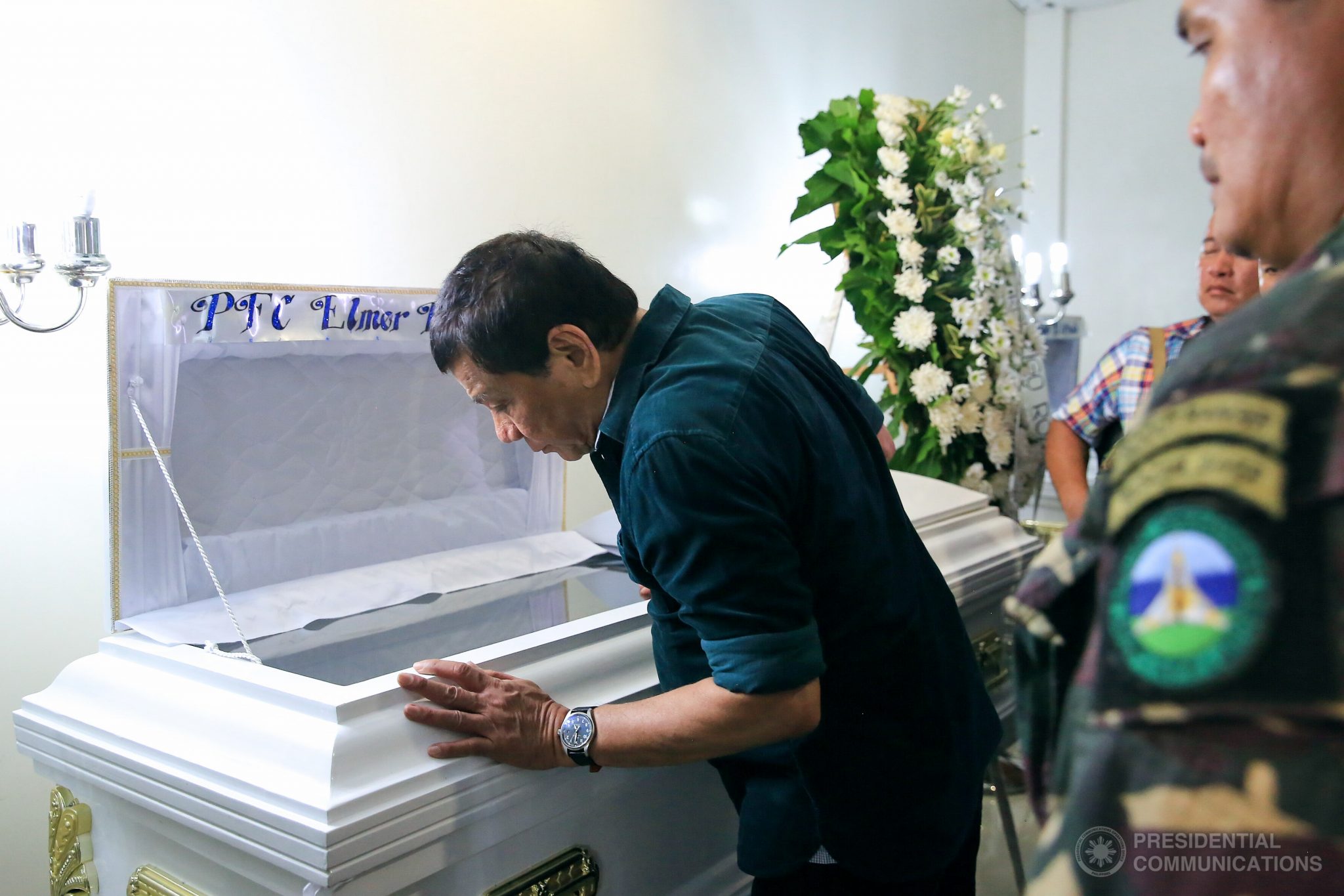 The 72-year old Philippine leader made a salute at each of the caskets of the slain soldiers and policemen as he laid a medal on the casket’s glass panel.