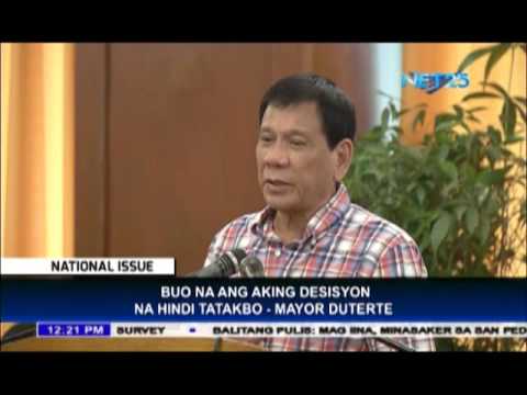 Remaining firm in his decision, Davao City Mayor Rodrigo Duterte said that he will not run for presidency in the 2016 elections, citing financial and health conditions as his main reasons.