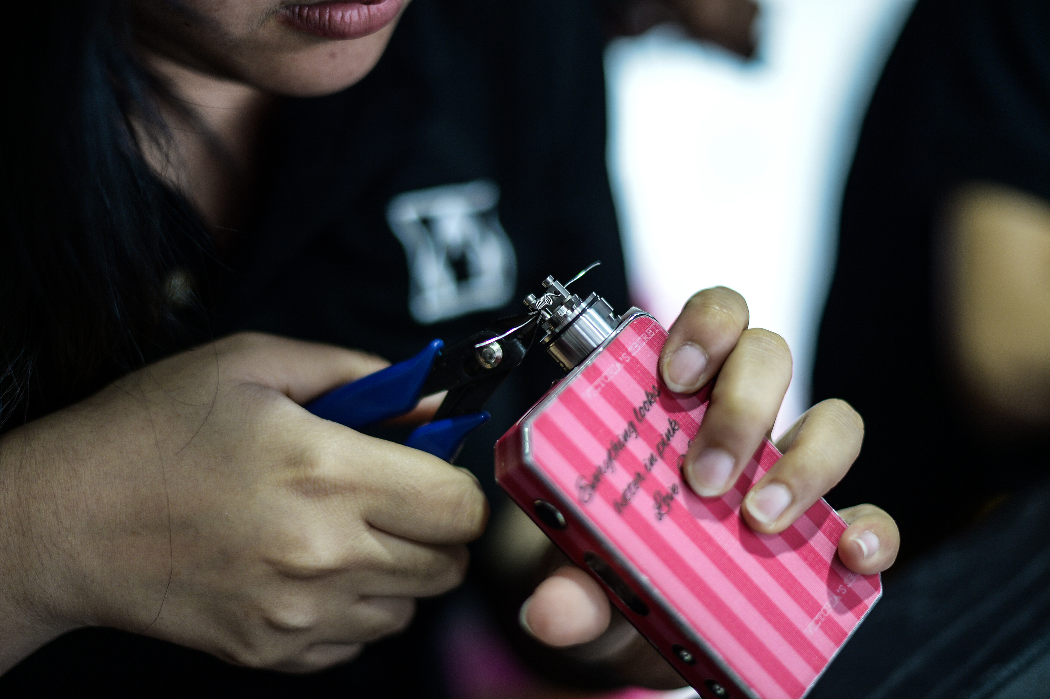 This picture taken on November 19, 2015 shows a worker inspecting a coil, the metal heating element in an e-cigarette that produces vapour from e-juices, at a vape shop in Kuala Lumpur. Vaping” is soaring in popularity in Malaysia, the largest e-cigarette market in the Asia-Pacific region, but authorities are threatening to ban the habit in for health reasons — a move that has sparked anger from growing legions of aficionados. AFP PHOTO /