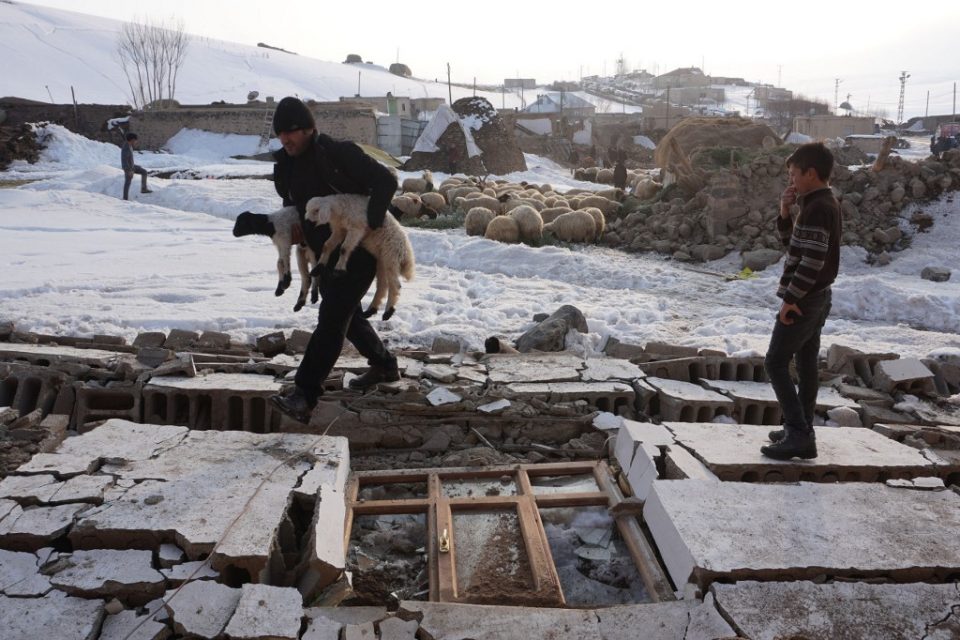 A Turkish man carries sheep in Baskale, in the Van province, after a magnitude 5.7 earthquake in northwestern Iran killed at least nine people in neighboring Turkey and injured dozens more on both sides of the border, authorities said. – The epicenter of the quake, which struck at 9:23 am (0553 GMT), was near the Iranian village of Habash-e Olya, less than 10 kilometers (six miles) from the border, according to the US Geological Survey. In Turkey, it was felt mostly in the eastern district of Baskale in Van province on the Iran border. (Photo by – / Demiroren News Agency (DHA) / AFP) / Turkey OUT