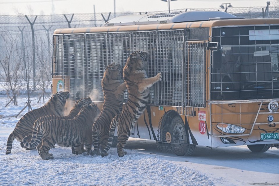 Siberian tigers are fed by visitors from a bus at the Siberian Tiger Park in Harbin, in China’s northeastern Heilongjiang province, on January 6, 2023. (Photo by Hector RETAMAL / AFP)