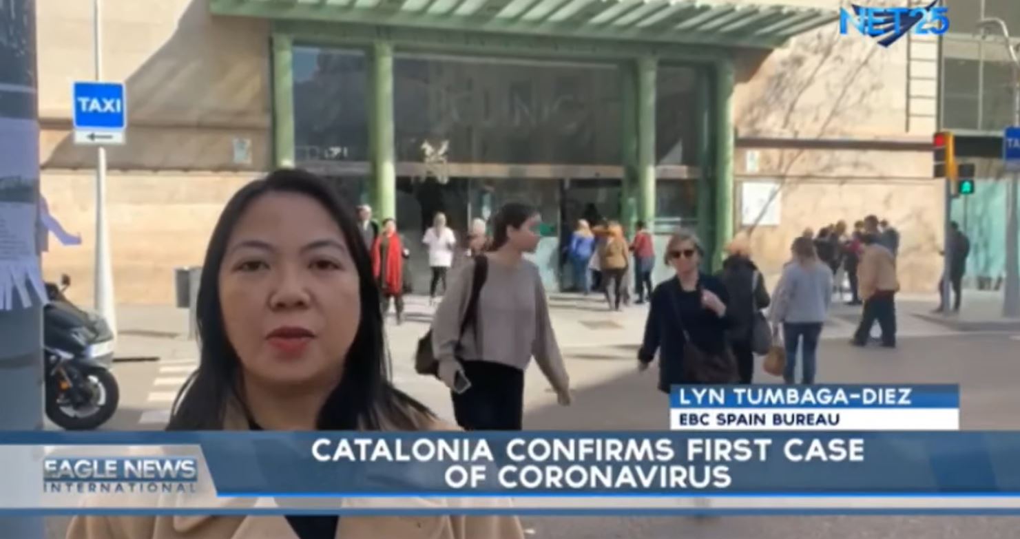 (Eagle News) — EBC (Eagle Broadcasting Corporation) Spain Bureau correspondent Lyn Tumbaga Diez reports on the first confirmed coronavirus disease case in Catalonia, Spain and interviews some of the residents there.