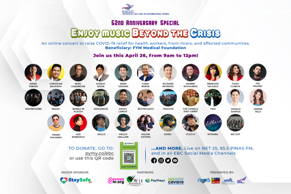 Thus, to commemorate its 52nd Anniversary, Eagle Broadcasting Corporation (EBC) will hold an online concert series to raise COVID-19 relief for health workers, front-liners, and affected communities with the FYM Medical Foundation as its sole beneficiary.