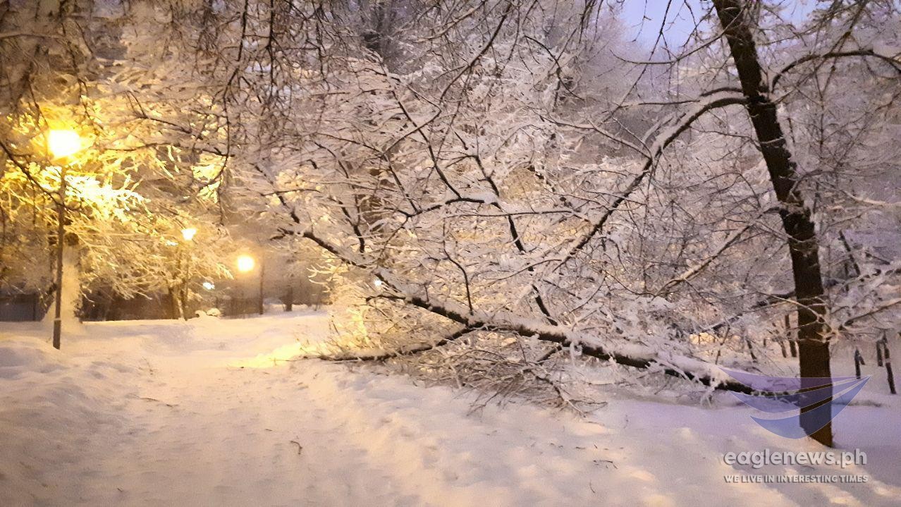 A street lamp casts a warm glow over snow-covered trees lining up a pathway in Moscow on Monday, February 5, 2018. Temperatures continue to dip in Moscow, fluctuating from negative 12 to negative 17 degrees Celsius. Photo by Emy Coloma, EBC Correspondent in Moscow, Russia. (Eagle News Service)