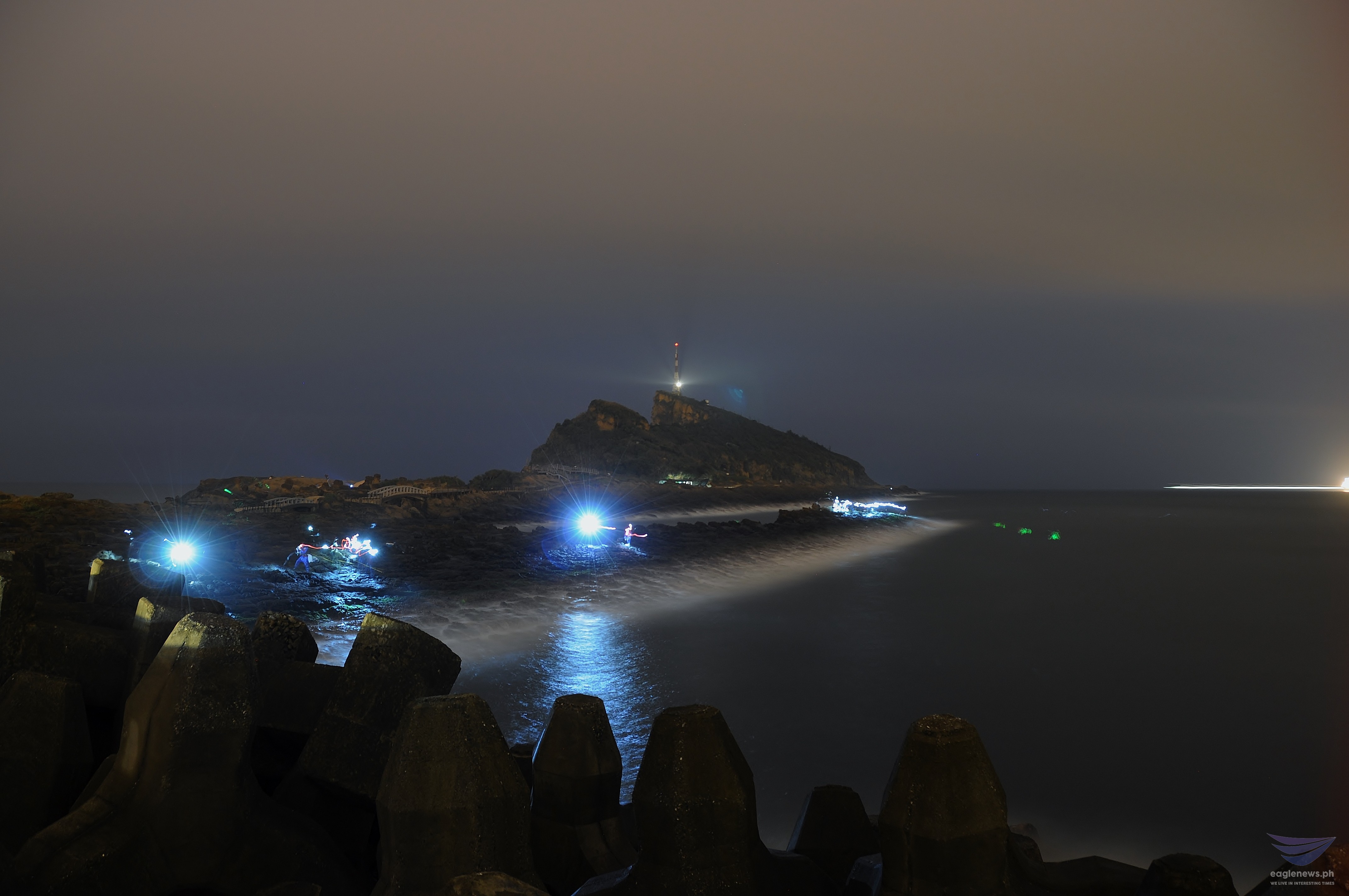 The lights on these fishing boats give a surreal feel to this scene in a port in Keelung ,Taiwan where a lighthouse can also be seen in the background. Long exposure photo by Armie Hsu, EBC correspondent in Taiwan. (Eagle News Service)