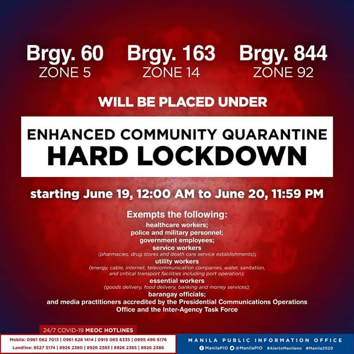 (Eagle News)–Several areas in Manila will be subjected to an “enhanced community quarantine hard lockdown” starting Friday, June 19.