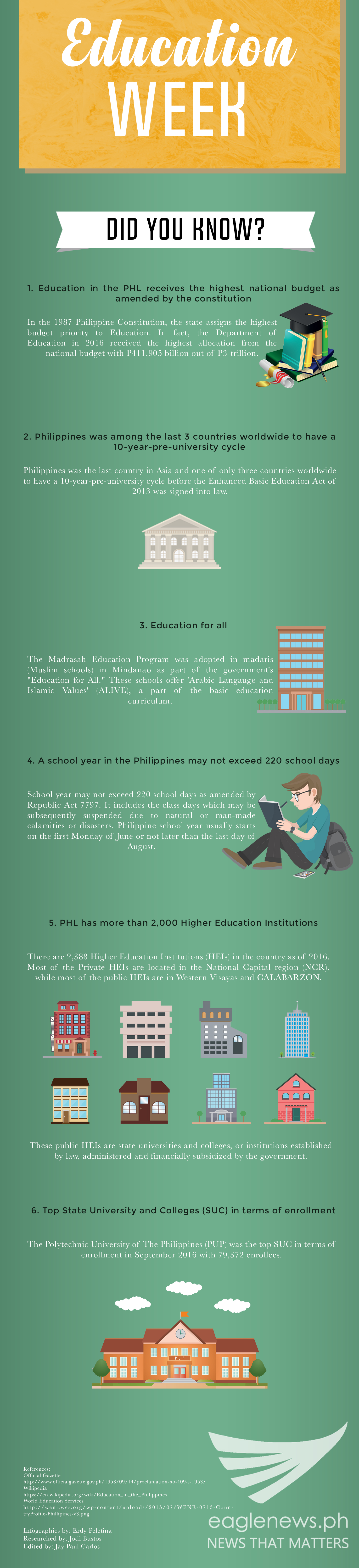 The Philippine government, by virtue of Proclamation No. 409, signed in 1953, declared the second week of September and the year thereafter as the “Education Week.”