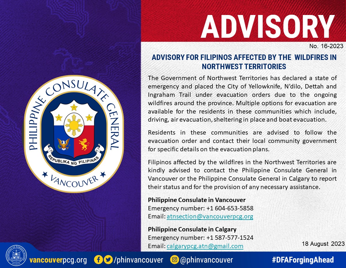 In the wake of the devastating wildfires sweeping through the Northwest Territories, Filipino residents are urged to seek assistance without hesitation. The Philippine Consulate Generals in Vancouver and Calgary stand ready to provide aid.