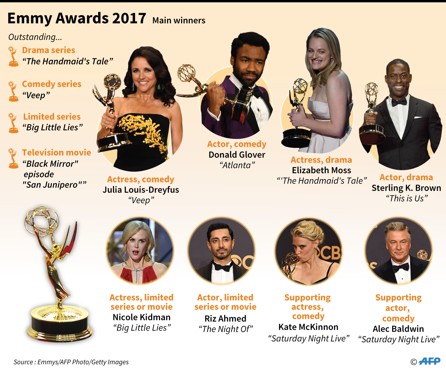 LOS ANGELES, United States (AFP) — Here is a list of the winners in key categories for the 69th Emmy Awards, which were handed out in Los Angeles on Sunday: