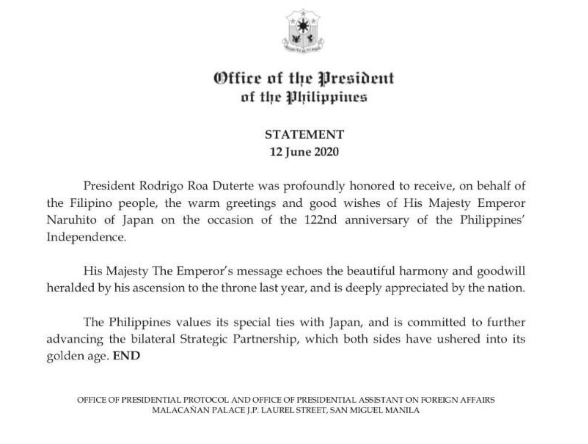 (Eagle News) — His Majesty Emperor Naruhito of Japan sent his “warm greetings and good wishes” to the Filipino people on the occasion of the 122nd anniversary of the Philippine Independence.