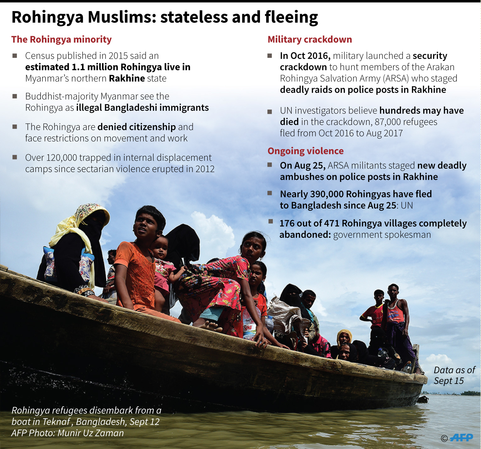 YANGON, Myanmar (AFP) — A military campaign to wipe out Rohingya insurgents has rained violence down on Myanmar’s Rakhine state, sending nearly 390,000 Muslim Rohingya refugees fleeing for sanctuary in Bangladesh.