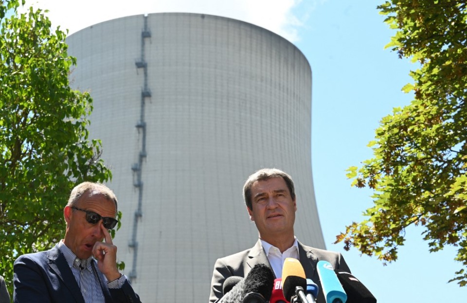 Leader of Germany’s Christian Democratic Union (CDU) Friedrich Merz (L) and Bavaria’s State Premier Markus Soeder and Friedrich Merz give a press conference after their visit of the Isar Nuclear Power Plant in Essenbach, southern Germany, on August 4, 2022. – German Chancellor Olaf Scholz on August 3, 2022 raised the possibility of keeping nuclear plants going. Extending the lifetime of the plants has set off a heated debate in Germany, where nuclear power has been a source of controversy. Former chancellor Angela Merkel spectacularly decided to ditch atomic energy in 2011 following the Fukushima nuclear disaster in Japan. (Photo by Christof STACHE / AFP)
