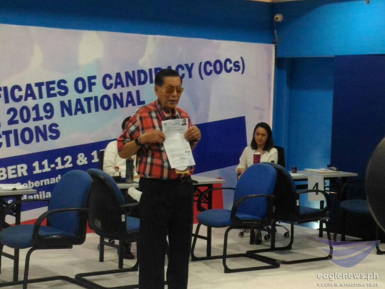 Juan Ponce Enrile refiles his certificate of candidacy as a senatorial bet for the May 2019 polls on Wednesday, Oct. 17, correcting an error in the earlier COC he had filed on Tuesday, Oct. 16, 2018. (Photo from Jerold Tago, Eagle News Service)