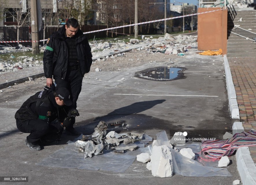 Ukrainian police officers inspect missile debris in front of a damaged building in Odessa, southern Ukraine on April 24, 2022, which was reportedly hit by missile strike. – (Photo by Oleksandr GIMANOV / AFP)