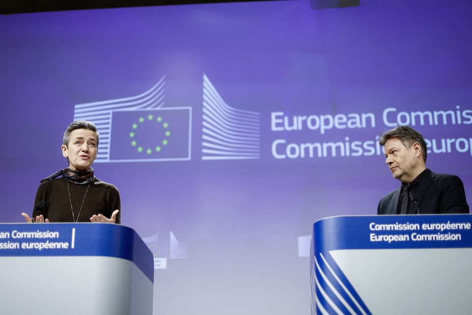 German Minister of Economics and Climate Protection Robert Habeck (R) listens to European Commission Vice-President in charge of Europe fit for the digital age and Commissioner for Competition Margrethe Vestager (L) as they attend a press conference at the EU headquarters in Brussels on January 8, 2024. . The European Union’s competition regulator said Tuesday it was looking into Microsoft’s investment into ChatGPT developer OpenAI to see if it merits further investigation under the bloc’s merger rules.  (Photo by Kenzo TRIBOUILLARD / AFP)