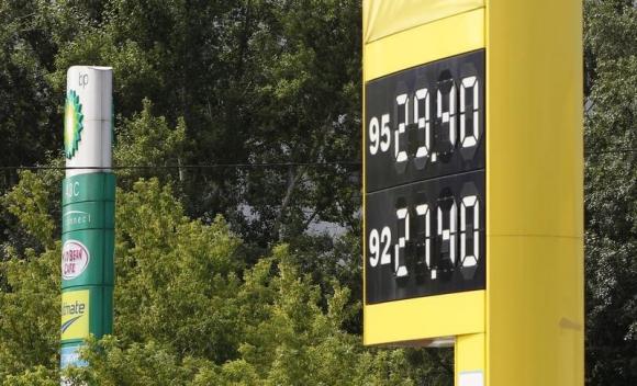 A gasoline station board displaying fuel prices stands beside a sign owned by a BP petrol station (L) in Moscow July 24, 2012.