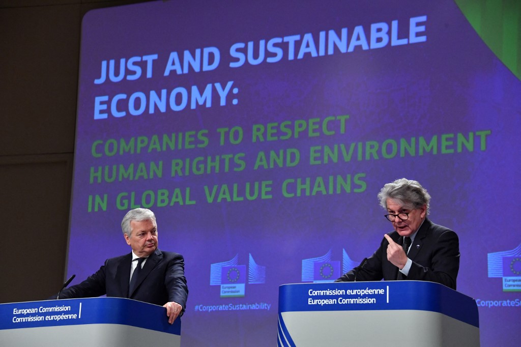 European Commissioner for Justice Didier Reynders (L) and European Commissioner for Internal Market Thierry Breton give a joint press conference on the Corporate Sustainability Due Diligence draft law at the EU headquarters in Brussels on February 23, 2022. – The EU’s Corporate Sustainability Due Diligence draft legislation aims at making companies accountable for environmental and human rights violations in their production chain. (Photo by JOHN THYS / AFP)