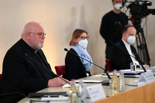 (L-R) Cardinal Reinhard Marx, the current archbishop of Munich and Freising, the office head of the archdiocese Munich and Freising Stephanie Herrmann and the archdiocese’s vicar general Christoph Klingan attend a press conference on January 27, 2022 in Munich, southern Germany, to comment on a report on child sex abuse in the Catholic Church. – The report published on January 20, 2022 by law firm Westpfahl Spilker Wastl (WSW) was commissioned by the archdiocese of Munich and Freising to examine how abuse cases were dealt with between 1945 and 2019. It found indications of sexually abusive behaviour in 235 people it investigated, including 173 priests, and accused former pope Benedict of failing to take action against offenders. (Photo by Sven Hoppe / POOL / AFP)