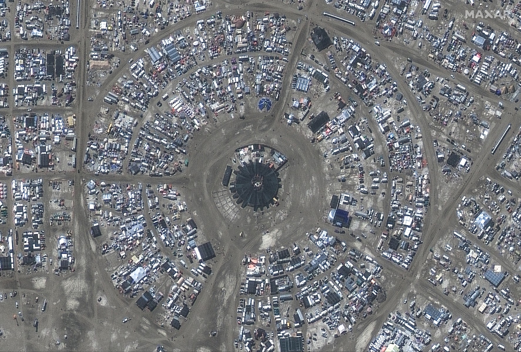 With the sun now shining on the colorful makeshift community of 70,000 people called Black Rock City, the roads opened Monday afternoon, kicking off the official exit process known as the “Exodus.” (Photo by – / Satellite image ©2023 Maxar Technologies / AFP)