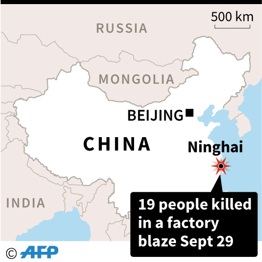 BEIJING, China (AFP) — A factory fire has killed 19 people in east China, local authorities said Monday, in the latest deadly incident to hit the country’s industrial sector.