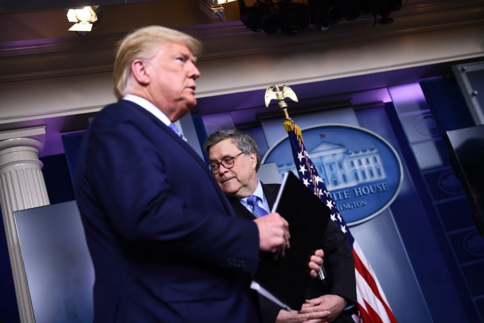 US President Donald Trump arrives as Attorney General William Barr looks on during the daily briefing on the novel coronavirus, COVID-19, at the White House on March 23, 2020, in Washington, DC. (Photo by Brendan Smialowski / AFP)