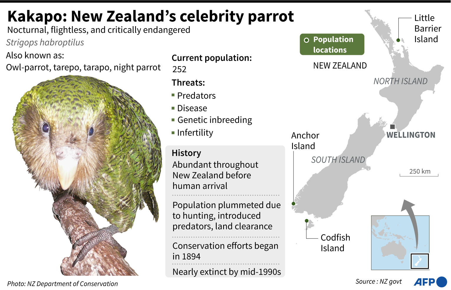Having previously teetered on the brink of extinction, the kakapo have recently had their best breeding season for 50 years, lifting their numbers from 197 to 252.